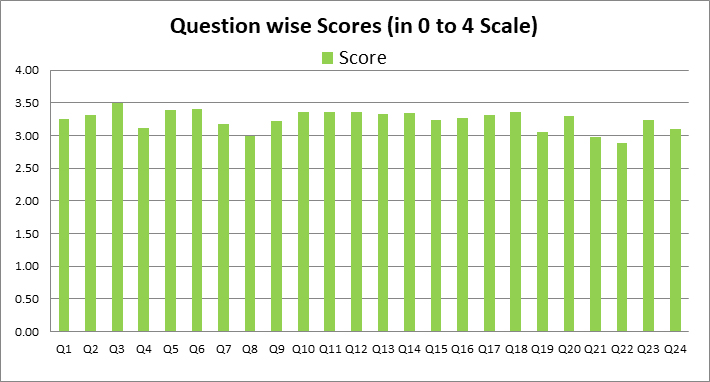 | 22 | How you are satisfy with the library facilities (i.e. Library and reading room facility, library books and journals, Library Staff approachability, Internet facility/Wi-Fi...) | 2.88 |