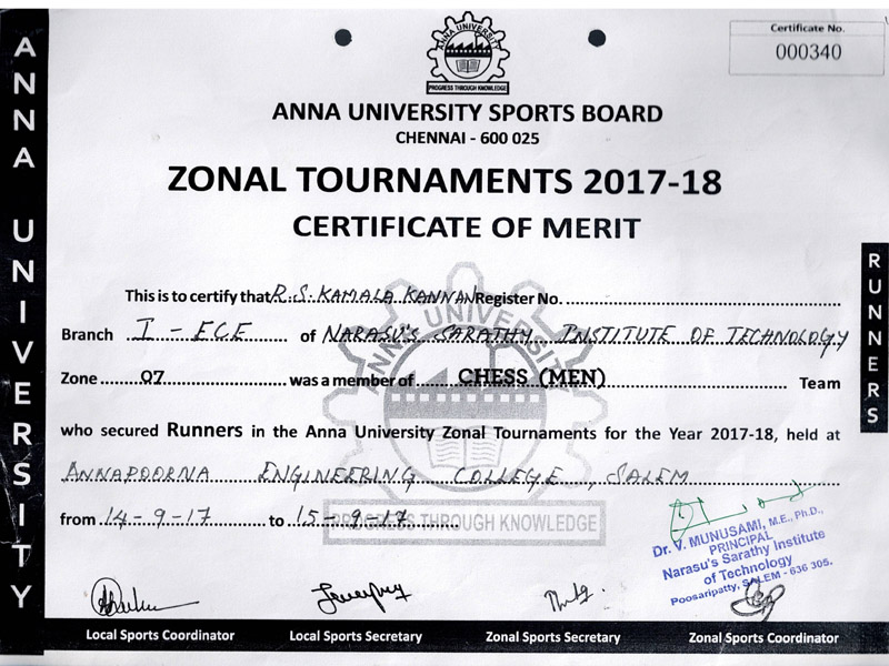 R.KAMALAKANNAN, Anna University Zonal Tournaments for the year 2017-18(Chess)