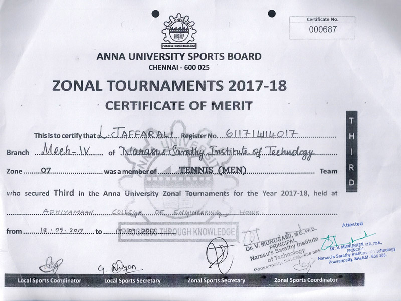 JAFFARALI, Anna University Zonal Tournaments for the year 2017-18