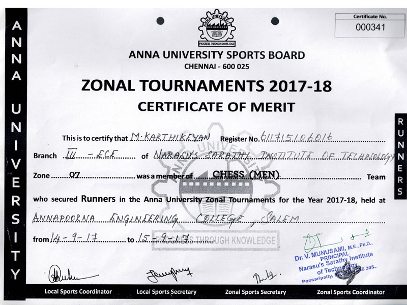 M.KARTHIKEYAN, Anna University Zonal Tournaments for the year 2017-18(Chess)