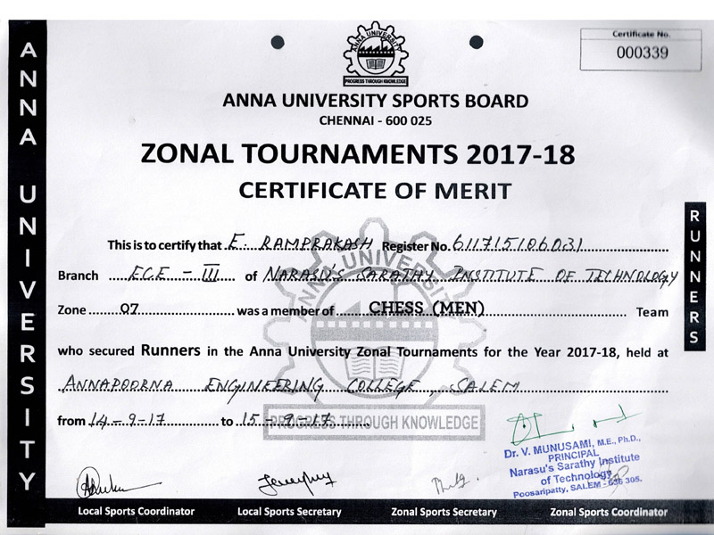 E.RAMPRAKASH, Anna University Zonal Tournaments for the year 2017-18