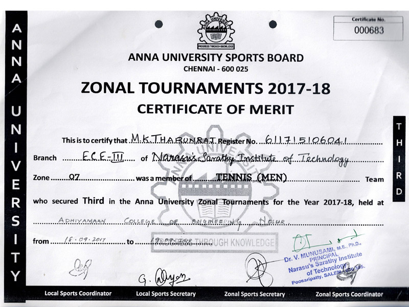 M.K.THARUNRAJ, Anna University Zonal Tournaments for the year 2017-18