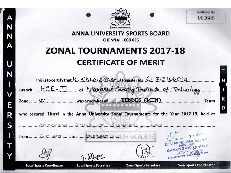 K.KALAIRASAN, Anna University Zonal Tournaments for the year 2017-18