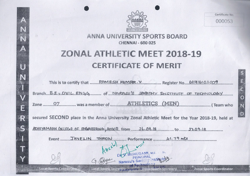 V.RAMESHKUMAR Anna University Zonal Athletic Meet for the year 2018-19(Javelin Throw)