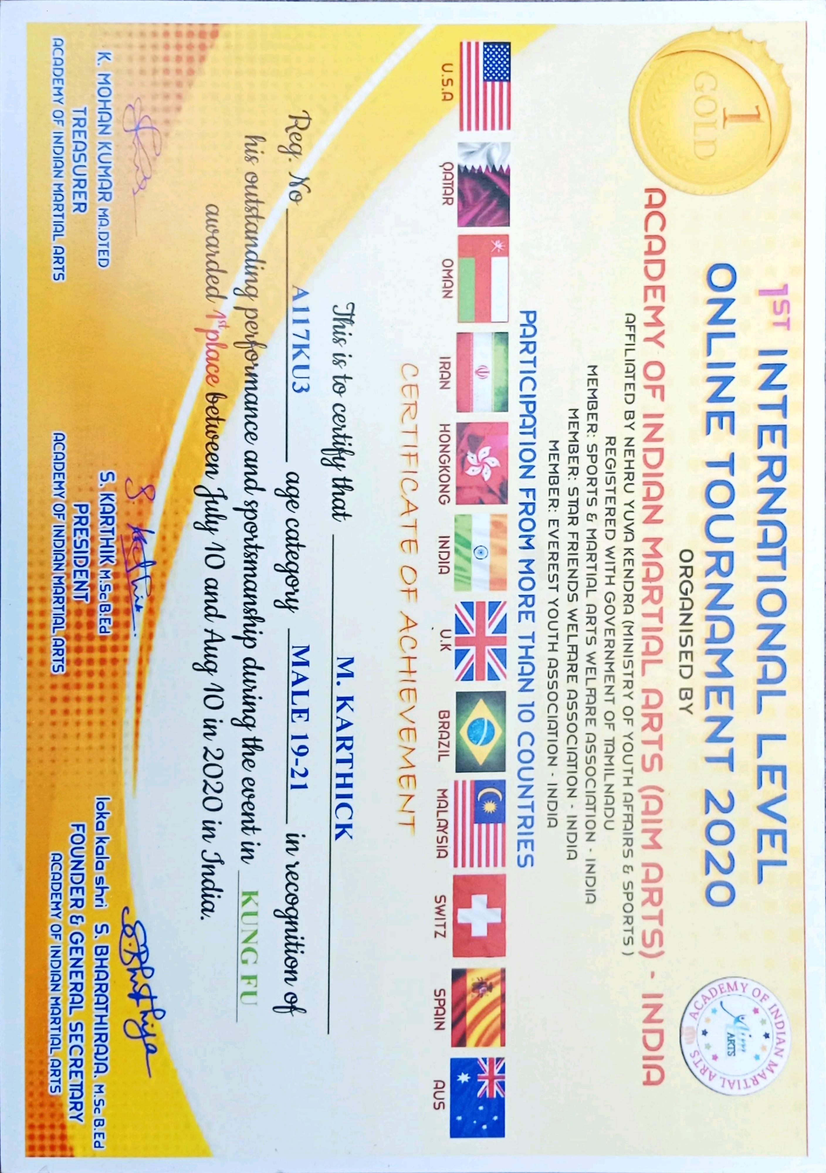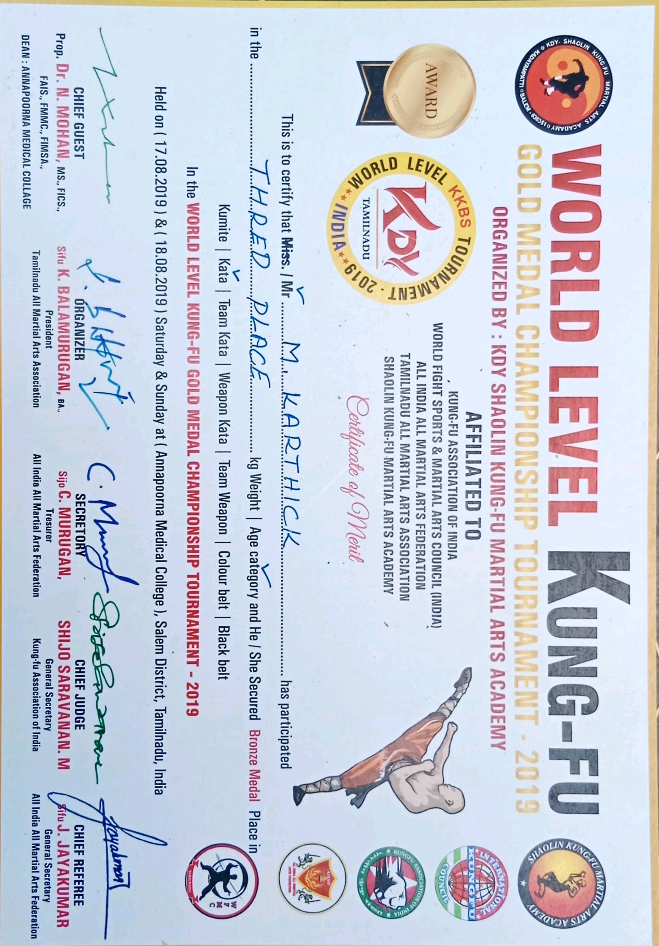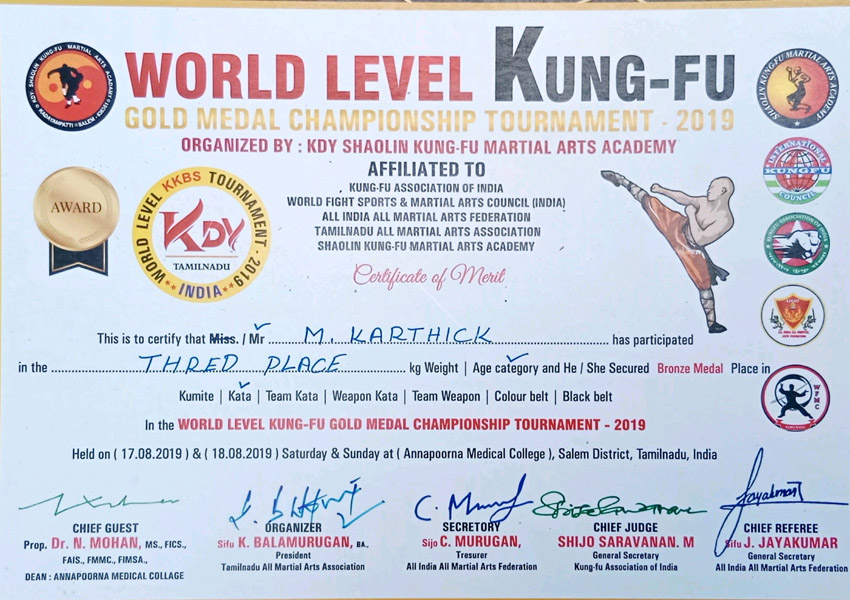 M.KARTHIK World Level Kung-Fu Gold Medal Championship Tournament-2019