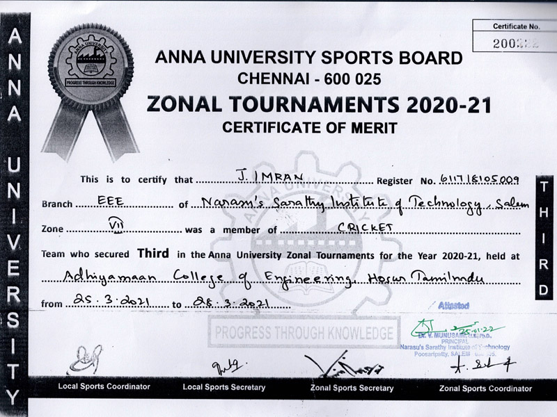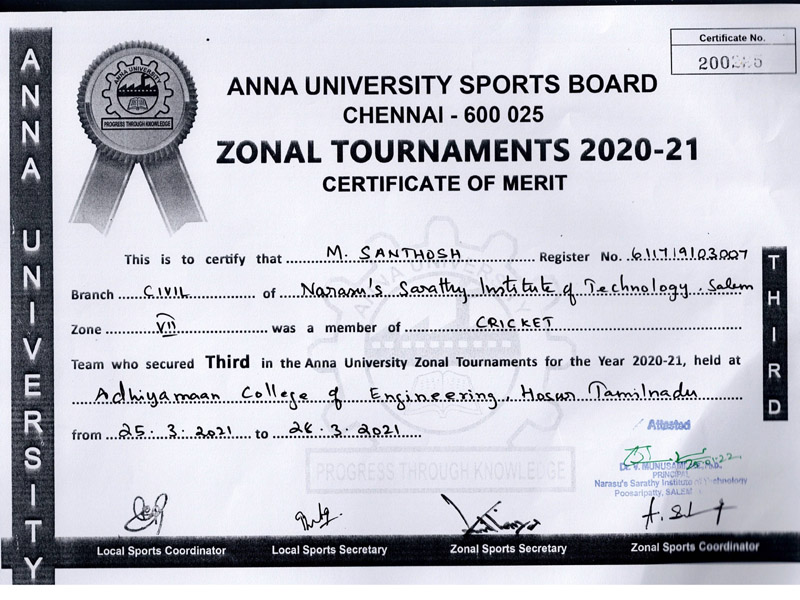 K.JAI SRIRAM Anna University Zonal Tournament for the year 2019-20(Cricket)