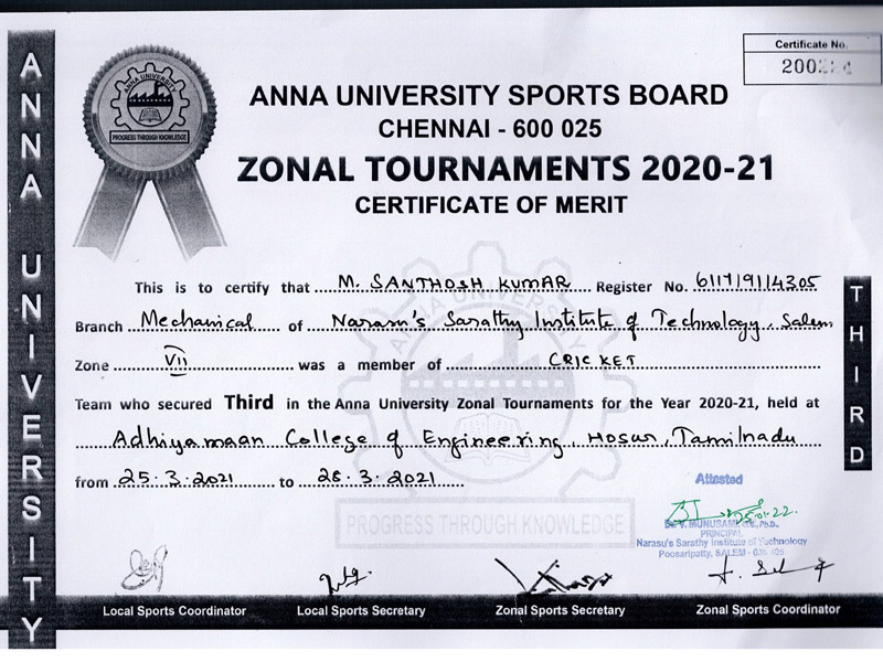 P.KARTHIK Anna University Zonal Tournament for the year 2019-20(Cricket)