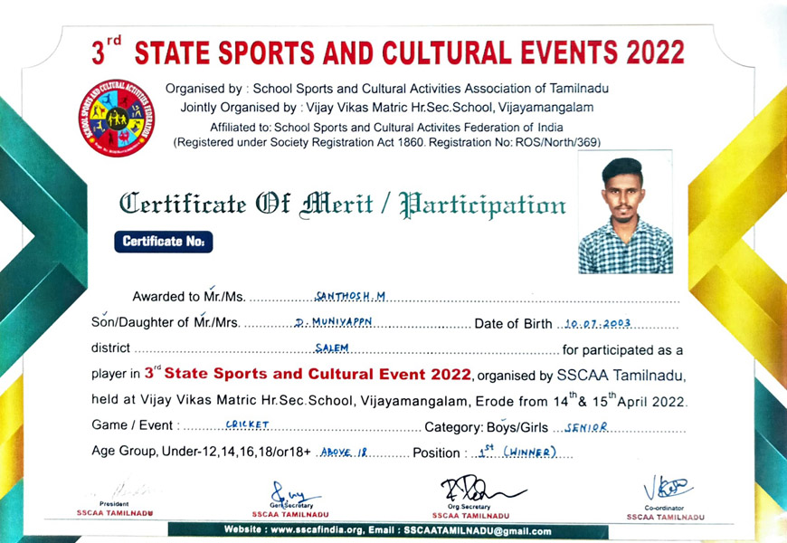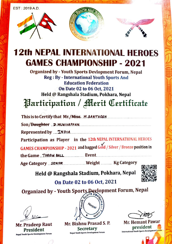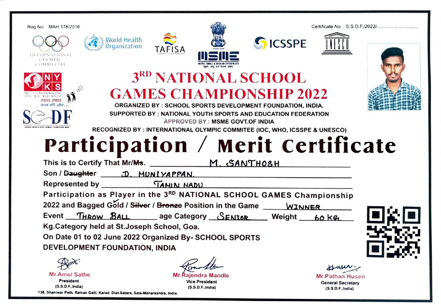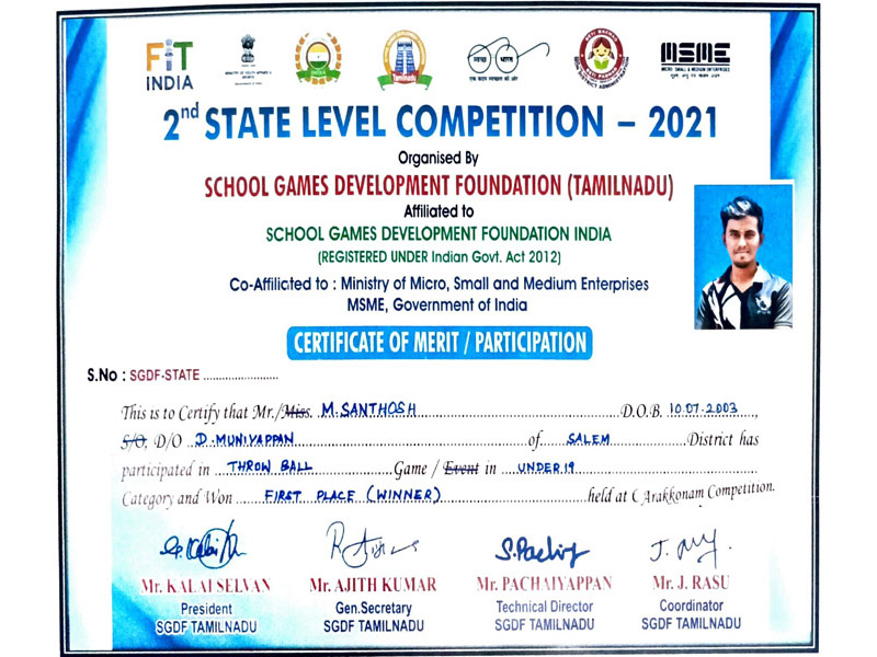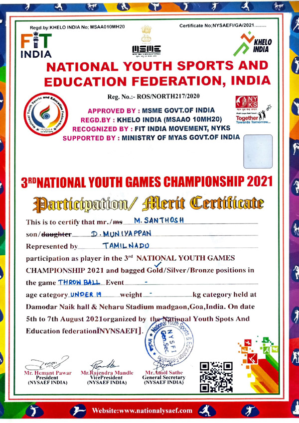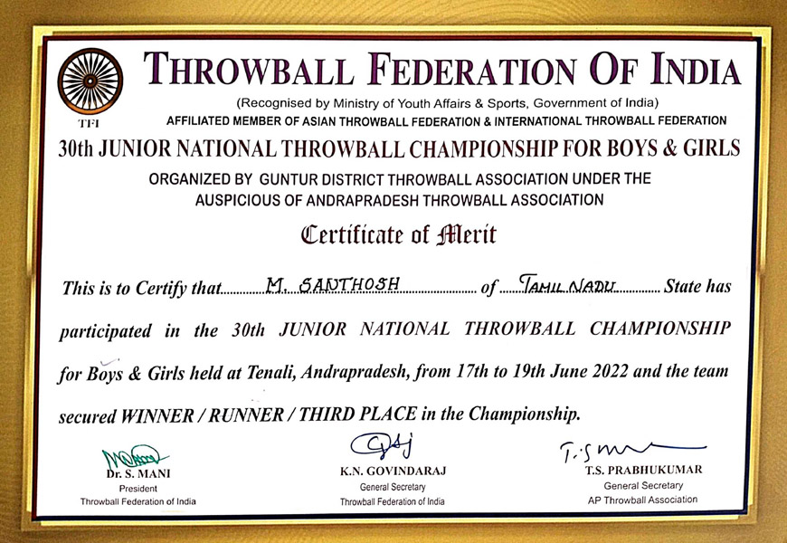 M.Santhosh 28th sub Junior 30th Junior & 43rd senior National Throwball championship