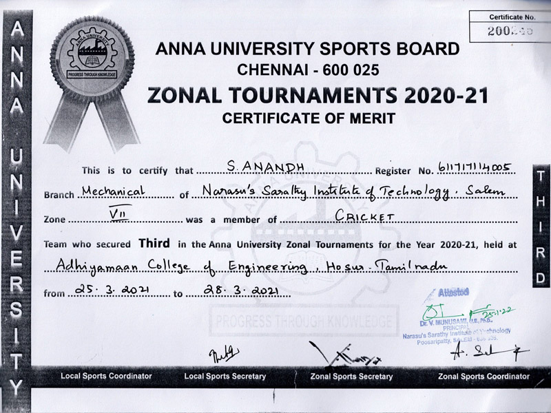 S.PARVATHARAJ Anna University Zonal Tournament for the year 2019-20(Cricket)