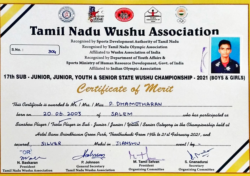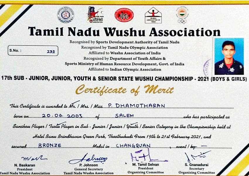 P.Dhamotharan 17th Sub Junior, Junior youth and Senior State level wushu championship