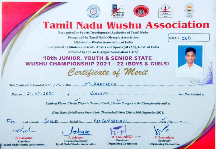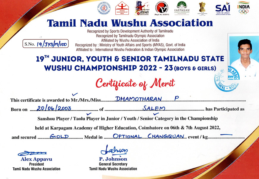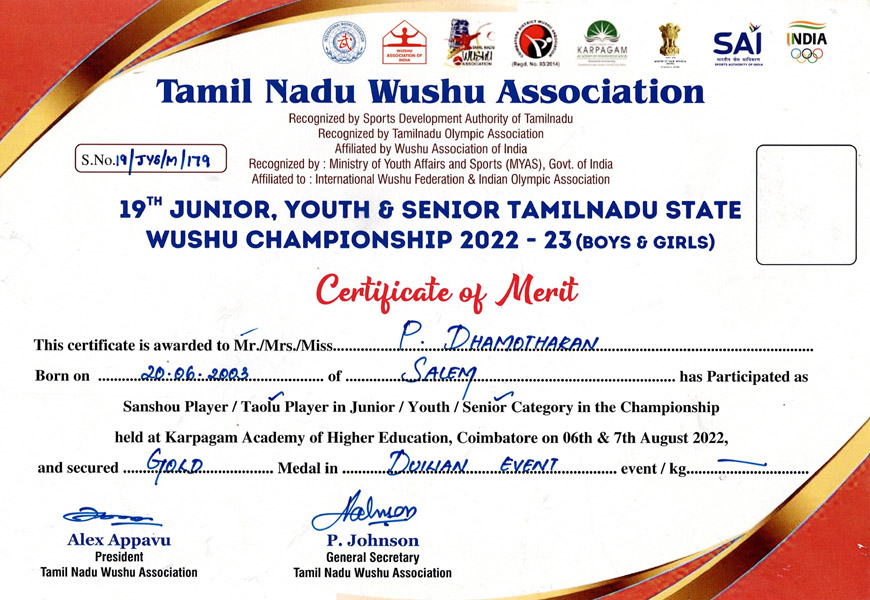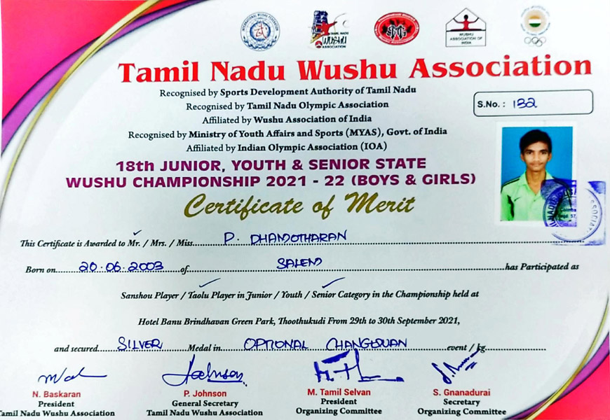 P.Dhamotharan 18th Junior, youth& Senior State wushu championship 2021-22