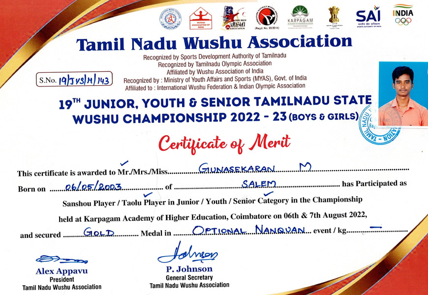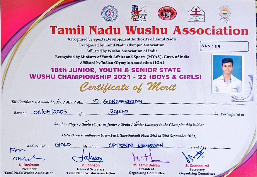 M.Gumasekar18th Junior, youth& Senior State wushu championship 2021-22(Boys& Girls)