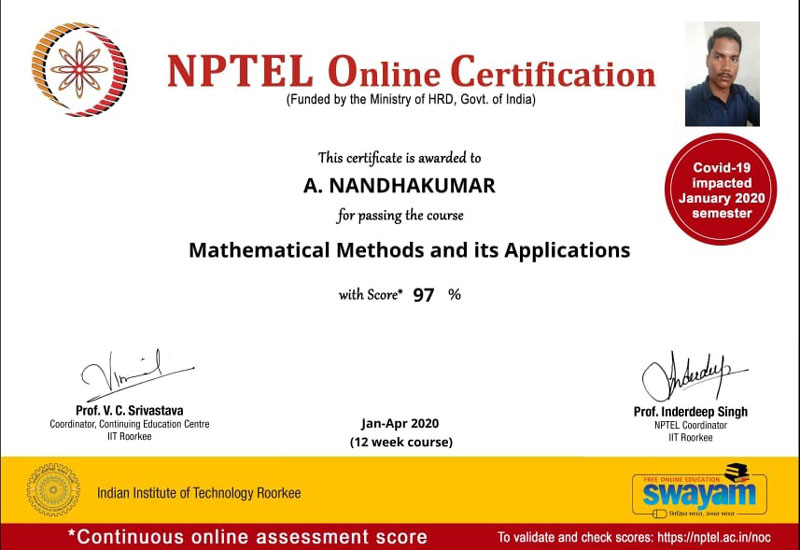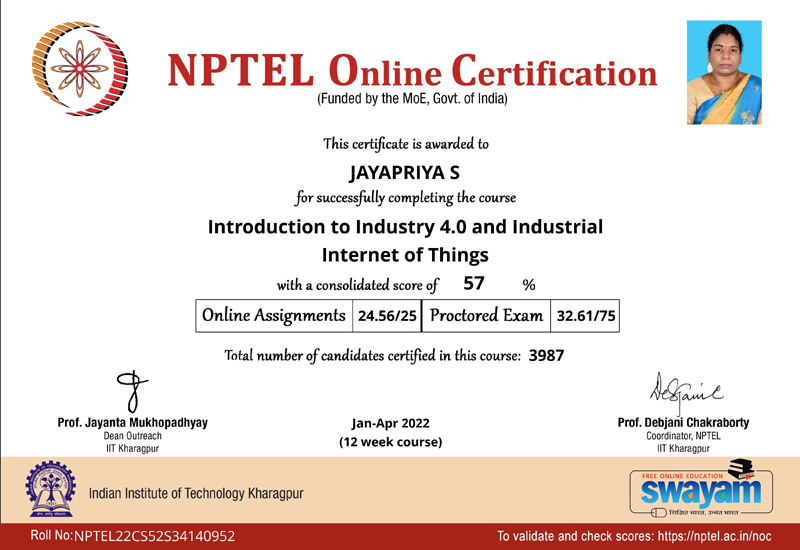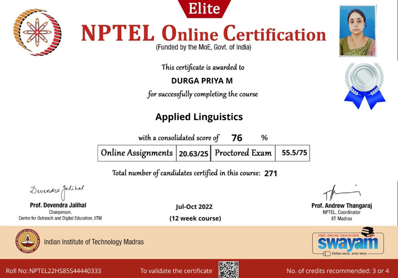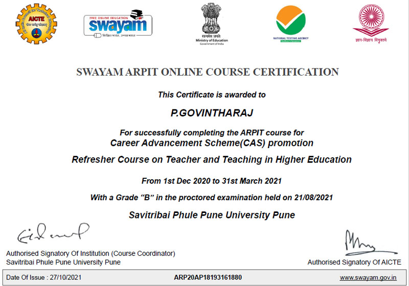 To develop self-learning skills, students are encouraged to obtain a certification in online courses before the completion of the programme from reputed agencies such as NPTEL, Coursera and to enhance academic knowledge on latest topics Faculty are encouraged to complete one MOOC for each semester. During the last three years the faculty members and students have completed NPTEL certification courses.