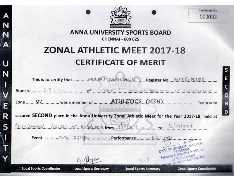 MURALIKRISHNAN, Anna University Zonal Tournaments for the year 2017-18