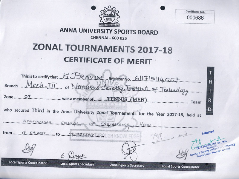 K.PRAVIN, Anna University Zonal Tournaments for the year 2017-18