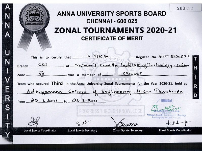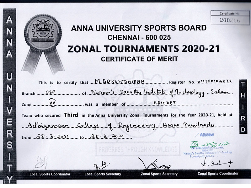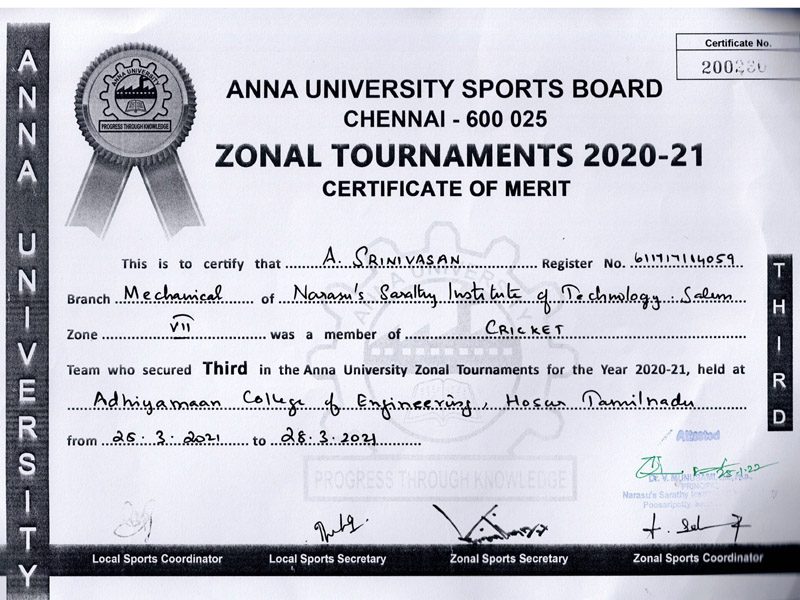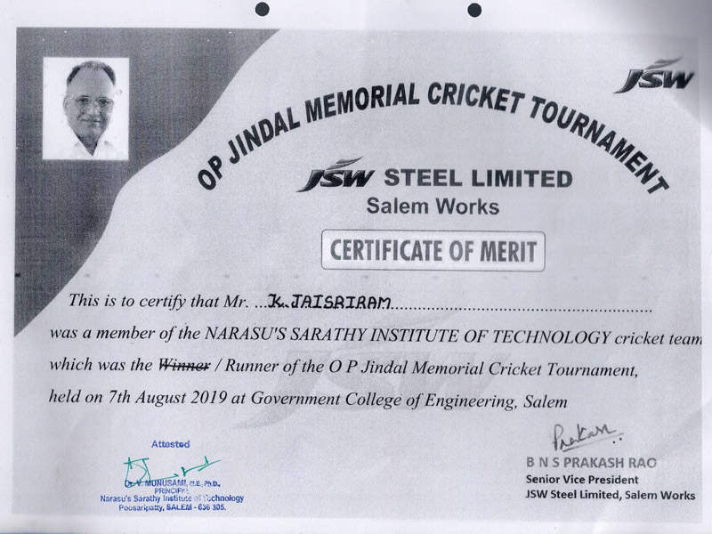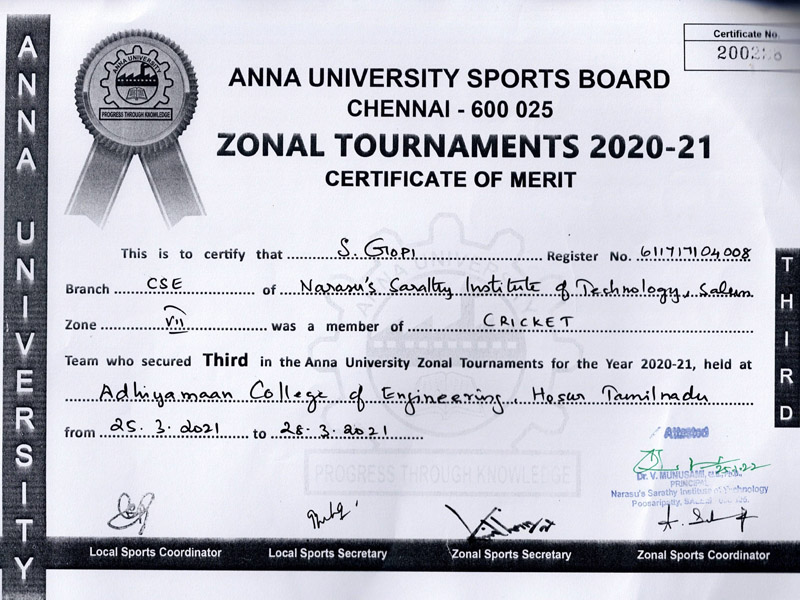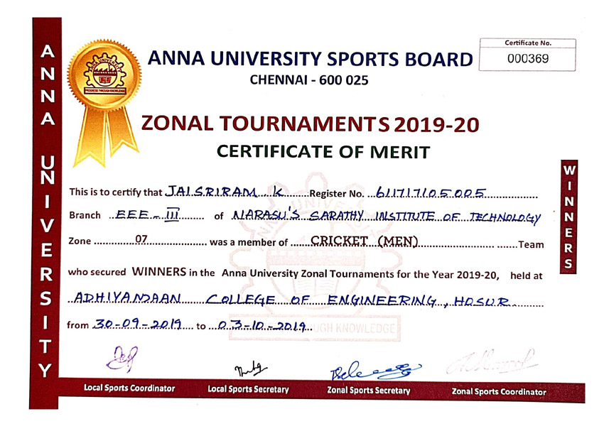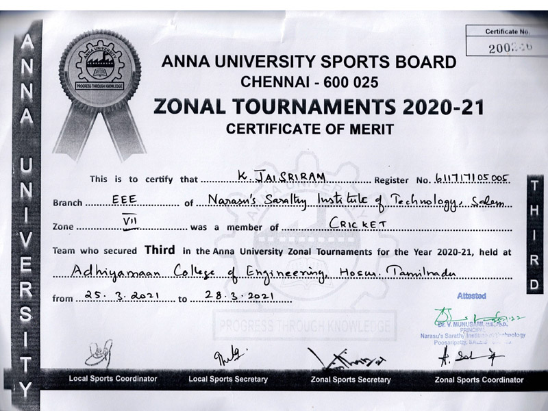 K.JAI SRIRAM Anna University Zonal Tournament for the year 2019-20(Cricket)