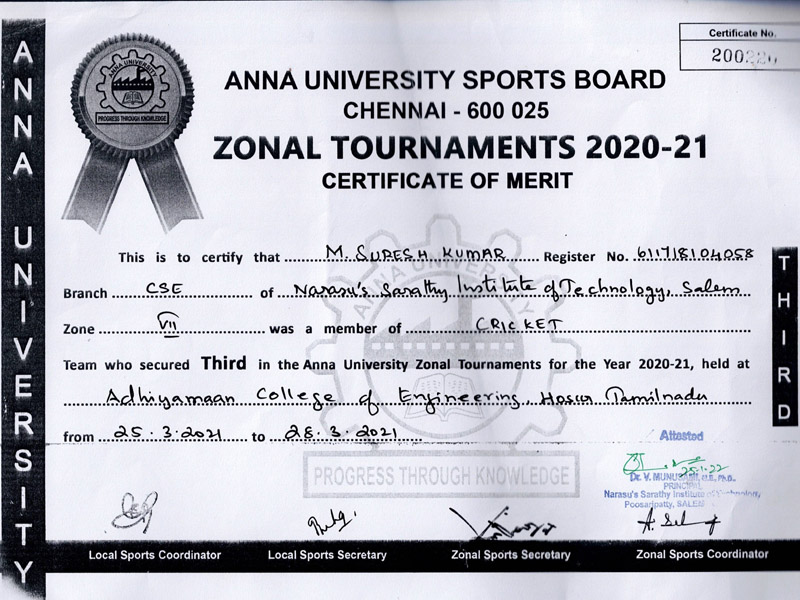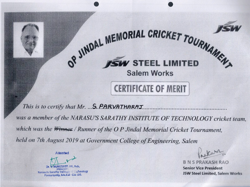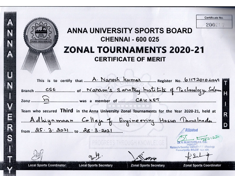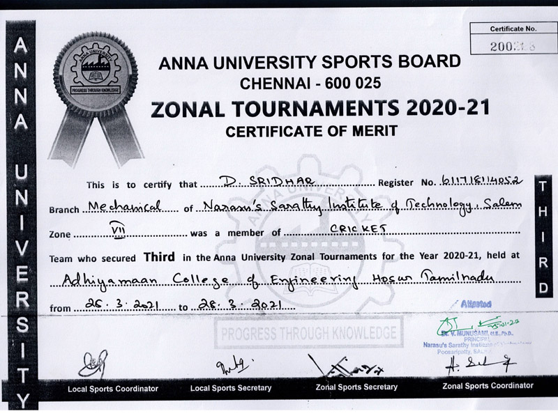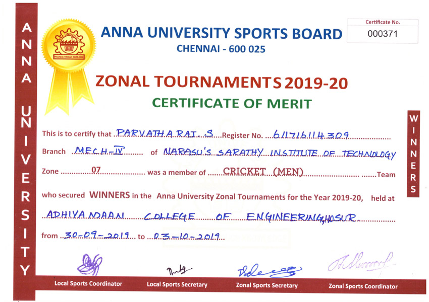 S.PARVATHARAJ Anna University Zonal Tournament for the year 2019-20(Cricket)