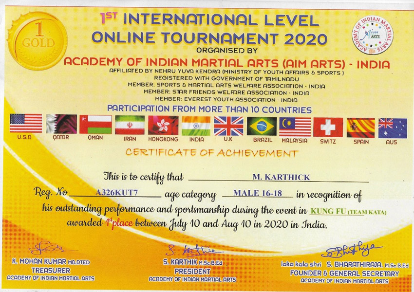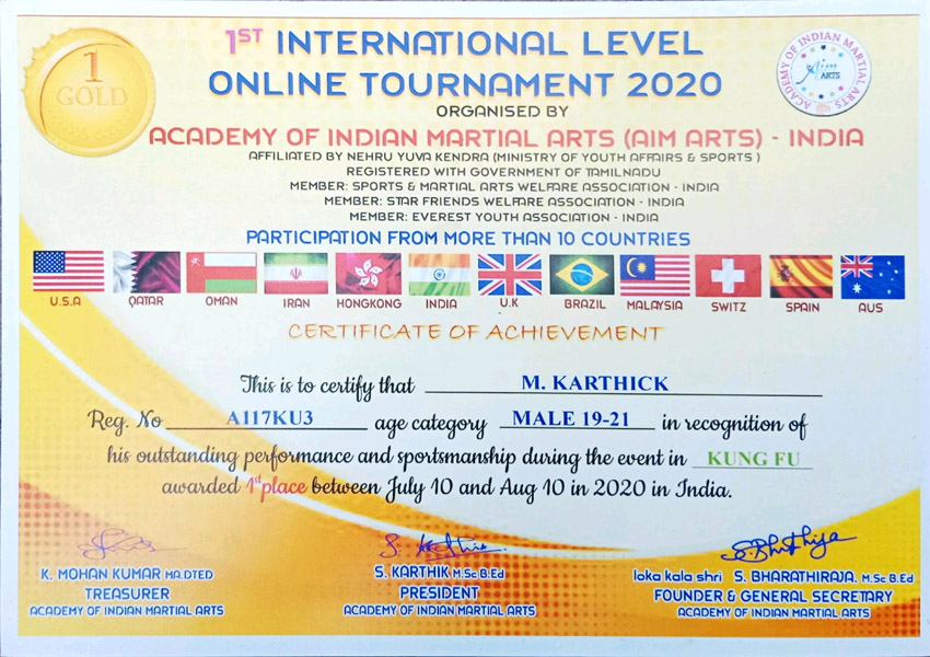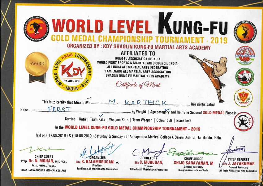 M.KARTHIK World Level Kung-Fu Gold Medal Championship Tournament-2019