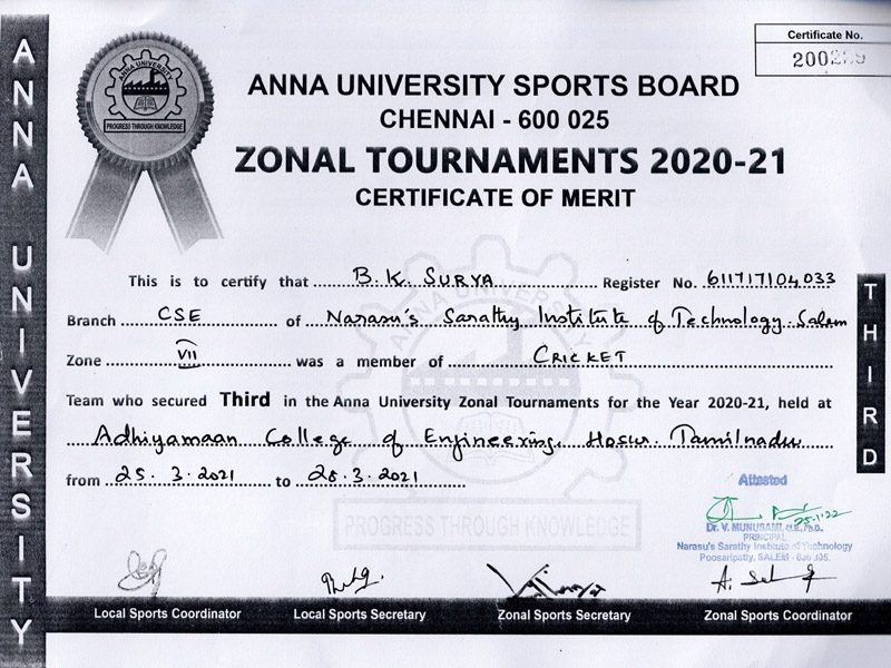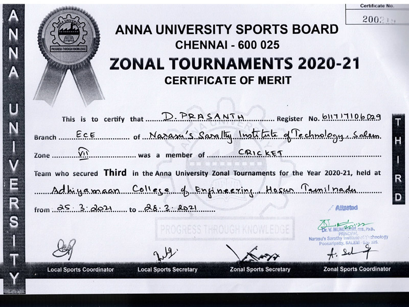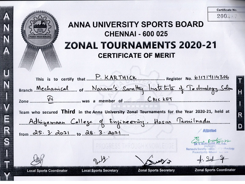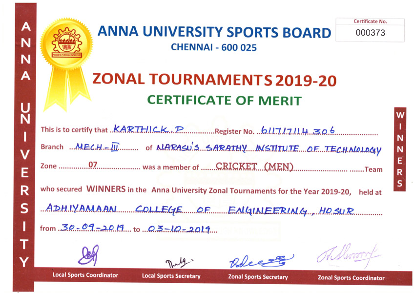 P.KARTHIK Anna University Zonal Tournament for the year 2019-20(Cricket)