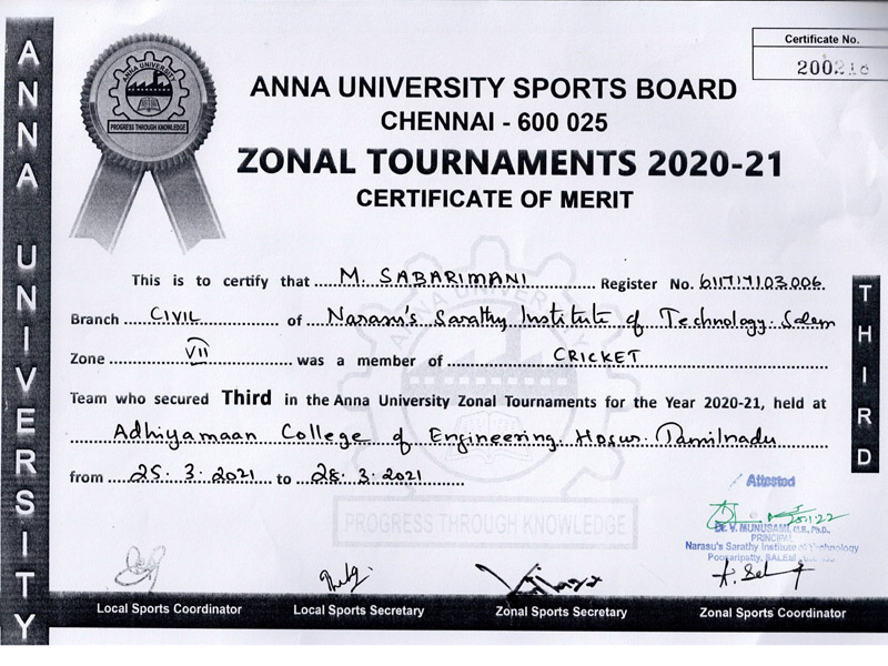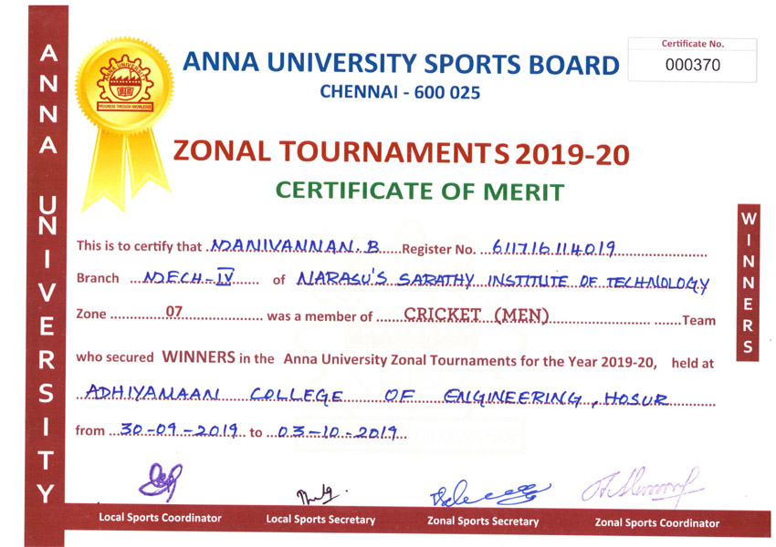 B.MANIVANNAN Anna University Zonal Tournament for the year 2019-20(Cricket)