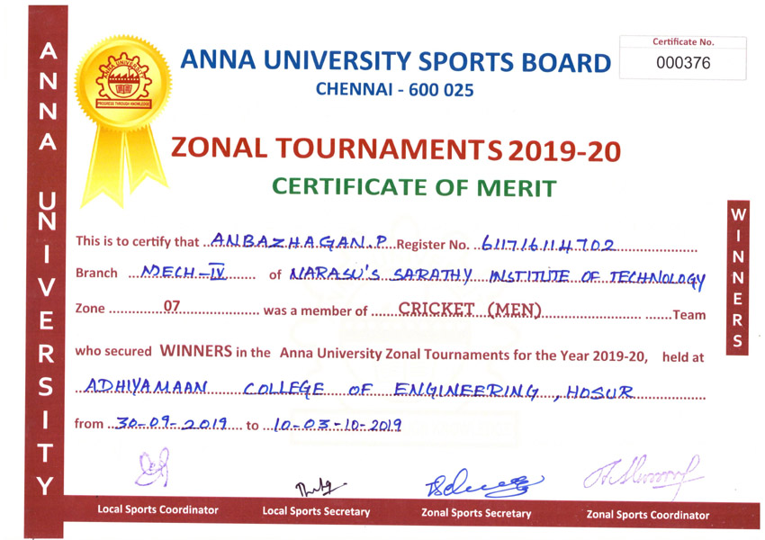P.ANBAZHAGAN Anna University Zonal Tournament for the year 2019-20(Cricket)