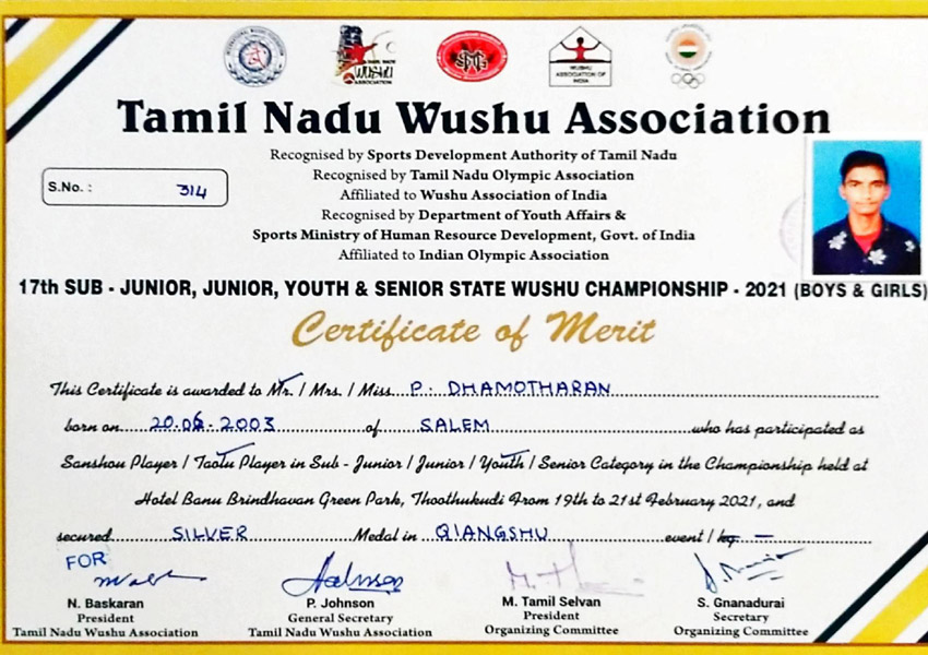 P.Dhamotharan 17th Sub Junior, Junior youth and Senior State level wushu championship