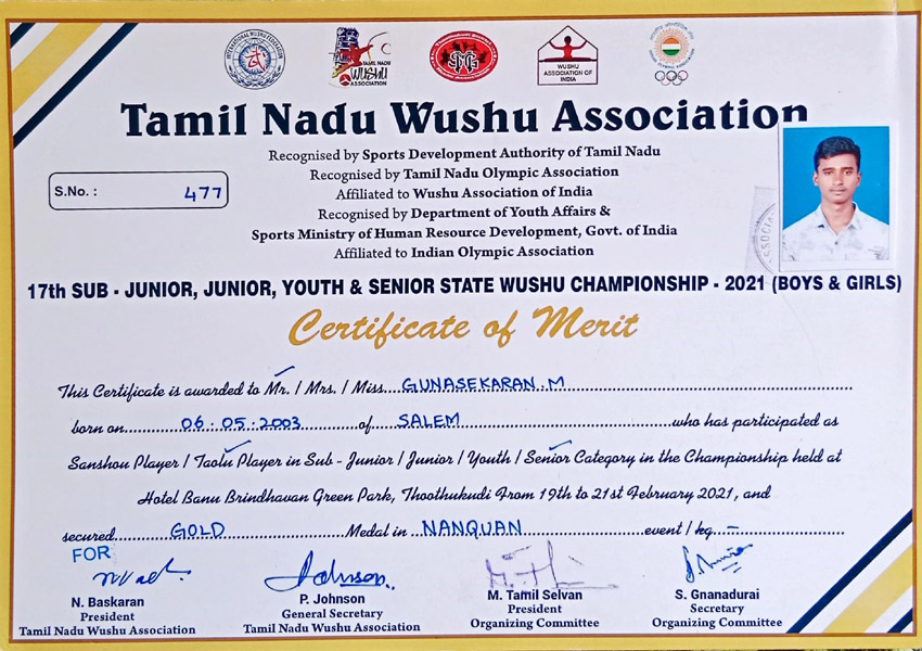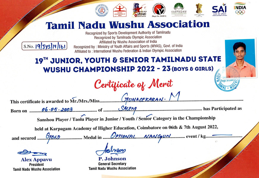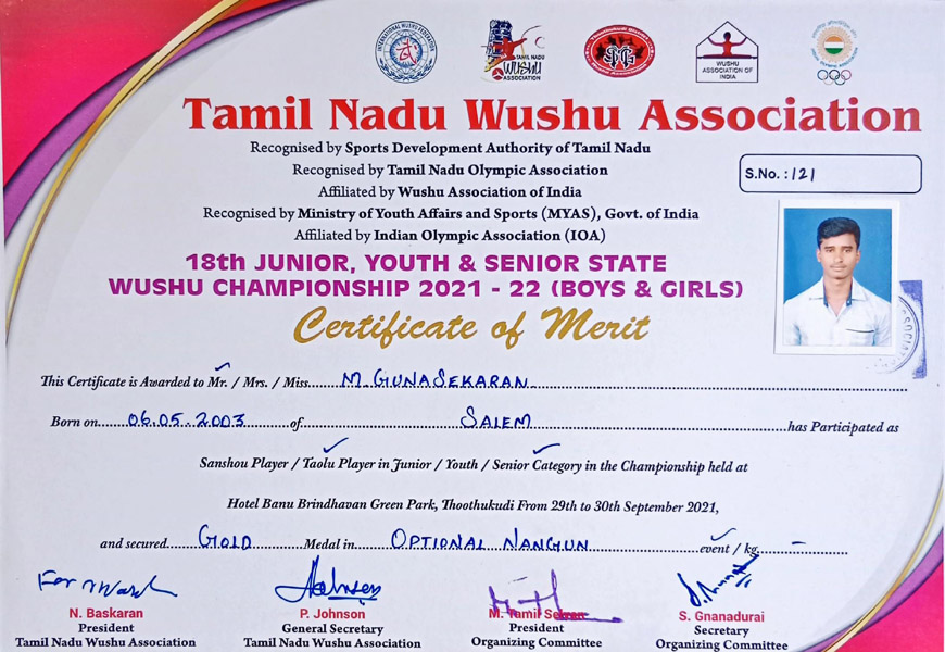 M.Gunasekar18th Junior, youth& Senior State wushu championship 2021-22(Boys& Girls)