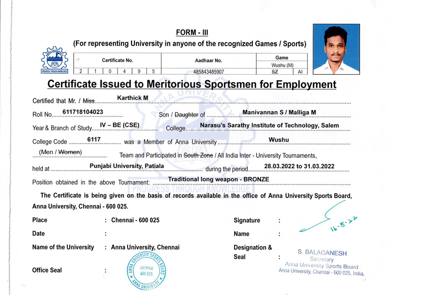 K.KALAIRASAN, Anna University Zonal Tournaments for the year 2017-18
