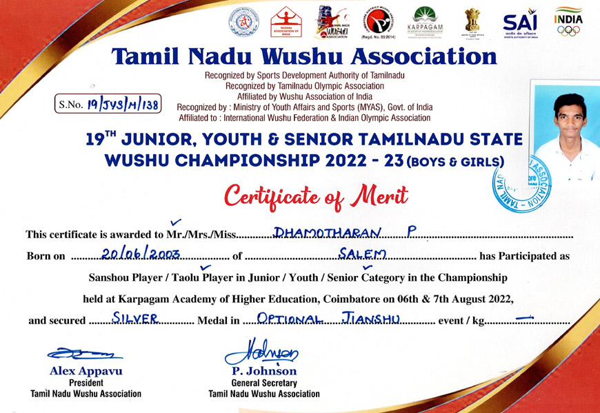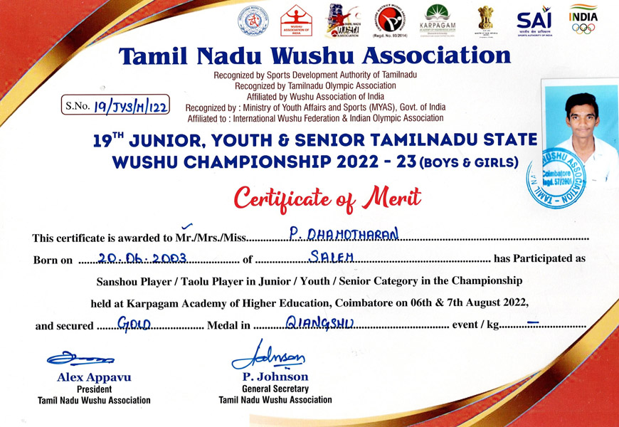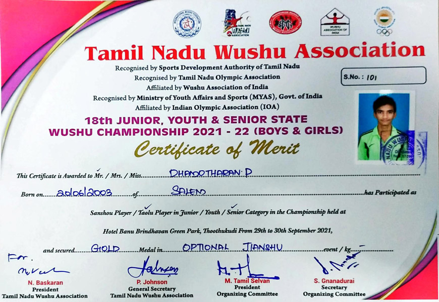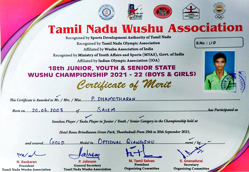 P.Dhamotharan 18th Junior, youth& Senior State wushu championship 2021-22
