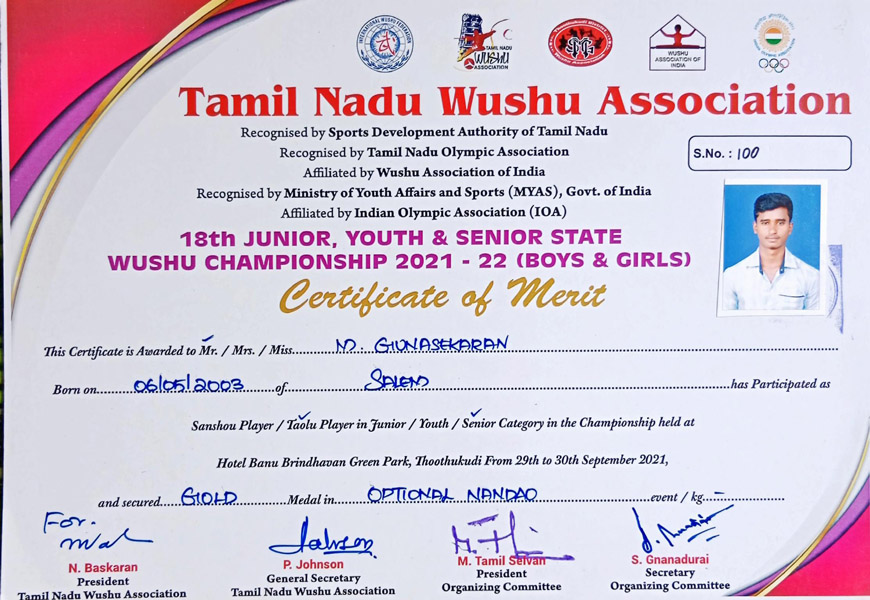 M.Gumasekar18th Junior, youth& Senior State wushu championship 2021-22(Boys& Girls)